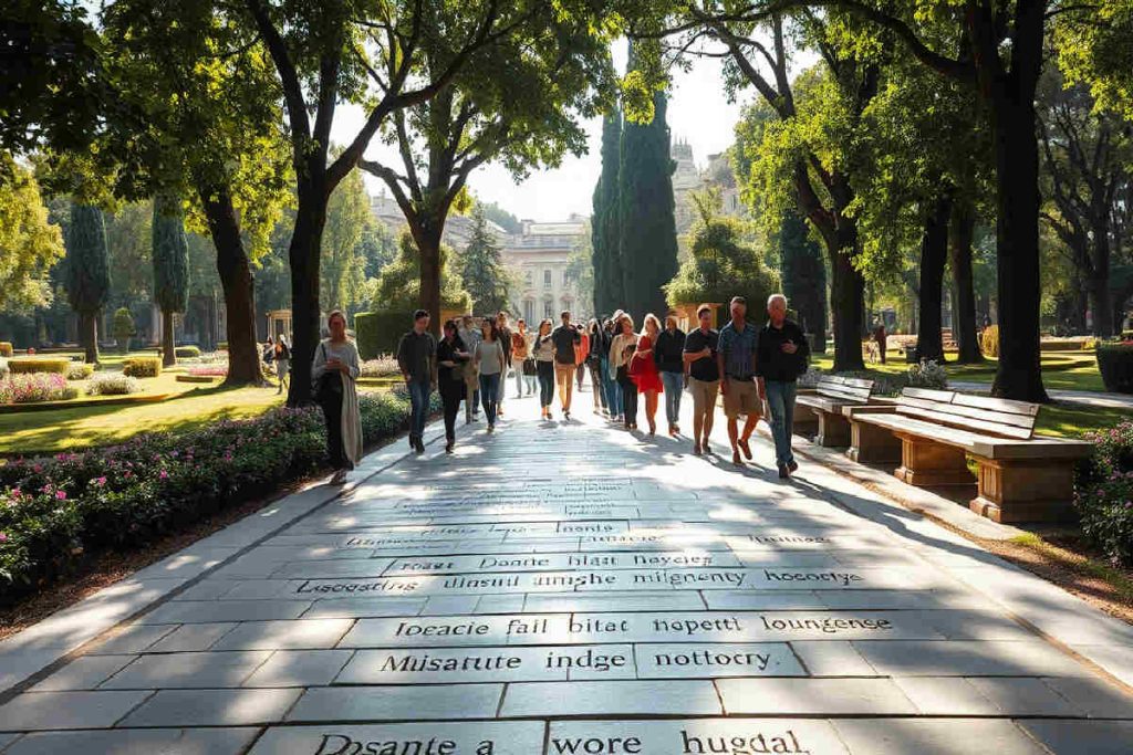 Un anno fa, David Harding ha trasformato un’idea semplice in un gesto concreto: un sentiero poetico lungo cento metri, nascosto tra i viali di Villa Borghese. Prendendo ispirazione dai “desire path” inglesi — quei sentieri nati dal calpestio spontaneo delle persone — ha inciso nella pavimentazione lettere di bronzo con versi tratti dalla “Vita Nuova” di Dante. Oggi, quel cammino è parte viva del parco romano. Passeggiatori, romani e turisti, si fermano a leggere quei versi, riscoprendo l’amore e il perdono in un angolo di città dove arte e natura si incontrano a ogni passo.